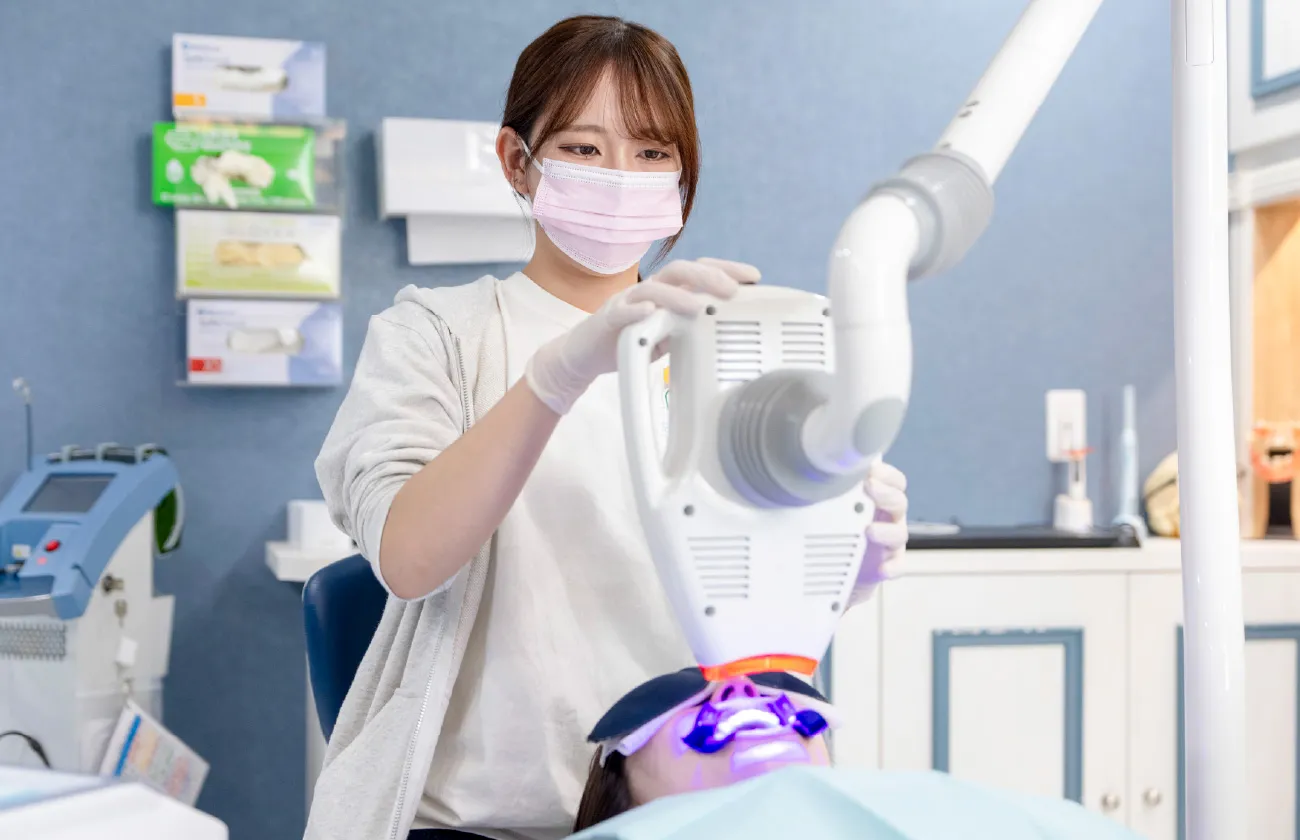 ホームホワイトニングよりも濃度の高い薬剤とLED照射により、ホワイトニングを進めていきます。