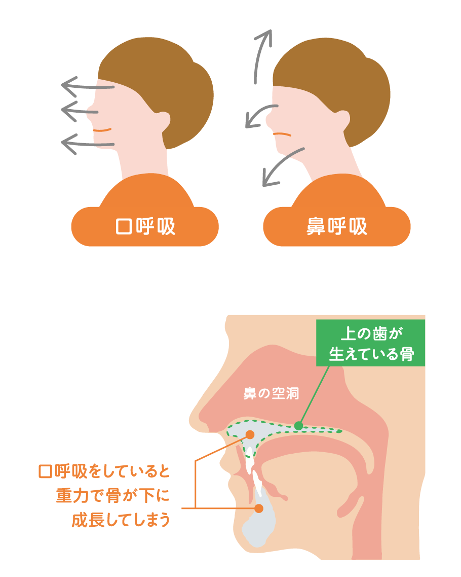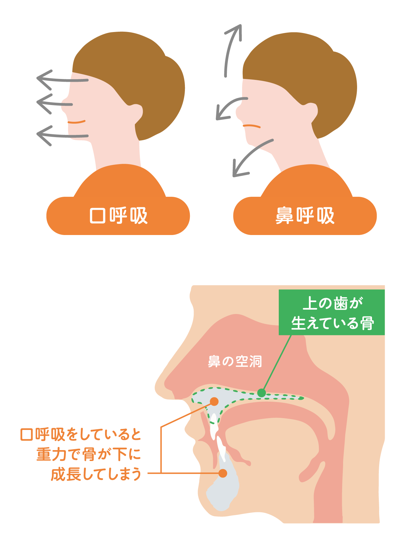 鼻で呼吸をすることで、鼻の空洞(鼻腔、副鼻腔)に空気抵抗と圧力がかかり、鼻の周りや頬の骨が前へと成長していきます。緑色で示した骨には上の歯が生えており、鼻呼吸をすることで前へ成長します。