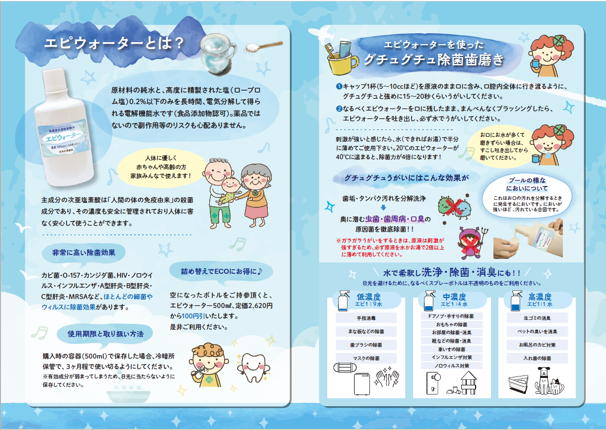 この除菌してくれるお水を、ゆめの森歯科では「エピウォーター」と呼んでいます。原材料は、不純物をできる限り取り除いた【純度の高い純水】と【高度に精製された塩】(ローブロム塩0.2%以下のみ)の2つだけ!純水と精製された塩を、長い時間をかけて電気分解し得られた電解機能水が「エピウォーター」です★