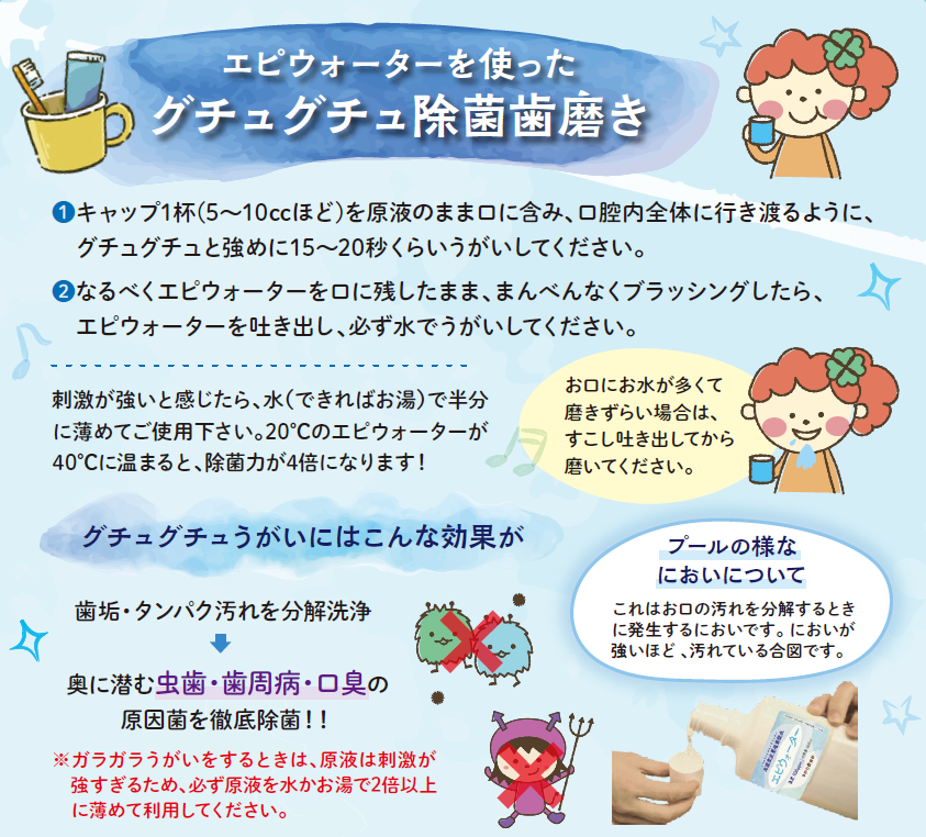 特に当院でおすすめしている「エピウォーター」の使い方が【グチュグチュ除菌歯磨き】★エピウォーターでグチュグチュうがいをすると、歯磨きで落とし損ねてしまった歯垢やたんぱく質汚れを分解洗浄してくれるので、歯の奥に潜む虫歯・歯周病・口臭の原因菌を徹底除菌できます (๑•̀ω•́)و✧