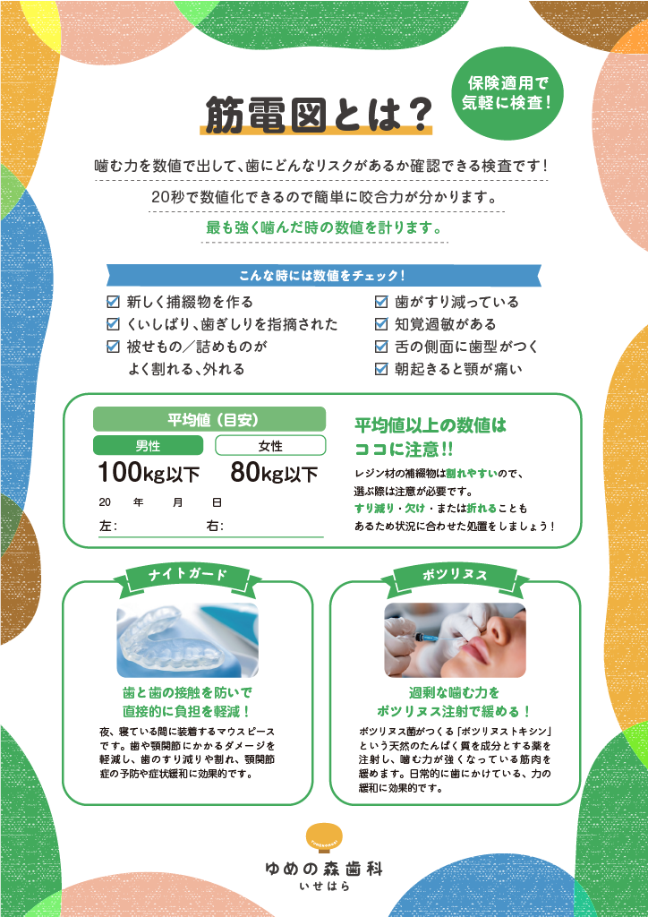 筋電図を使用することで、噛む力を数値で出し、歯にどのようなリスクがあるか確認することが出来るようになりました。